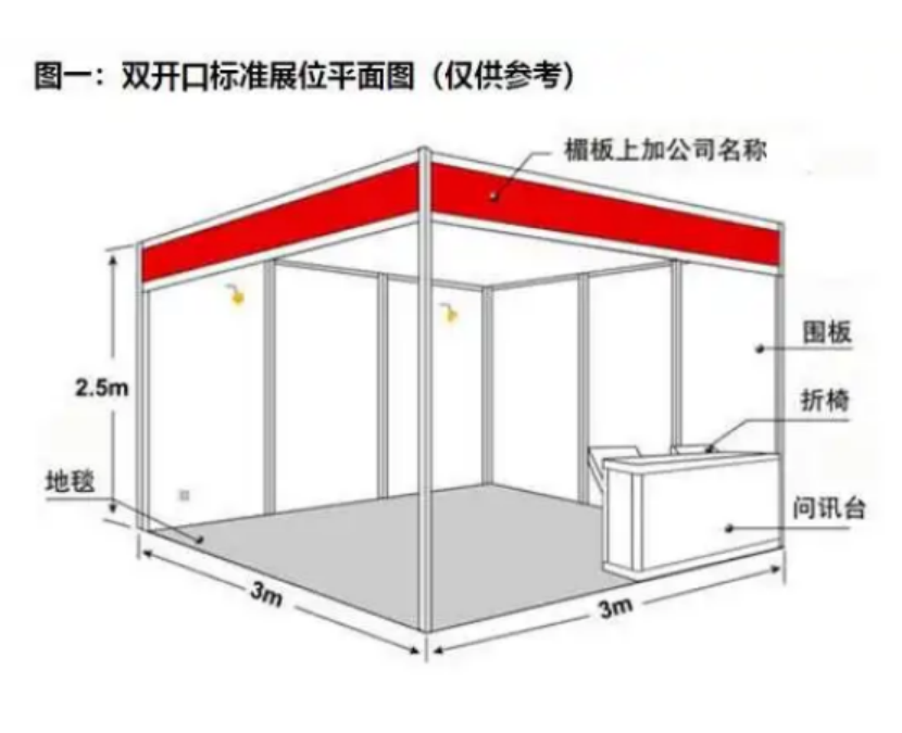 標準展位配備:三面展板、楣板、一張洽談桌、兩把折疊椅、220V電源插座。