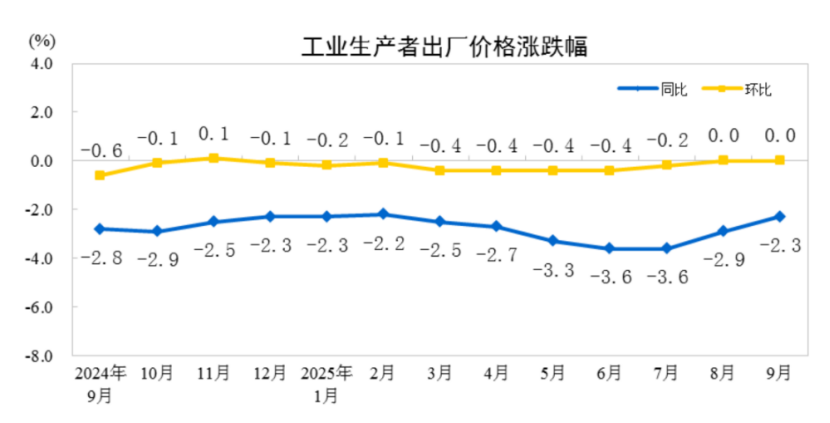 【機床商務網欄目 市場分析】2025年9月份,全國工業生產者出廠價格同比下降2.3%,降幅比上月收窄0.6個百分點,環比繼續持平。工業生產者購進價格同比下降3.1%,降幅比上月收窄0.9個百分點,環比上漲0.1%。1—9月平均,工業生產者出廠價格比上年同期下降2.8%,工業生產者購進價格下降3.2%。