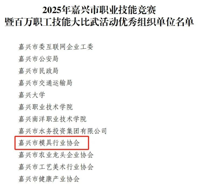 【機(jī)床商務(wù)網(wǎng)欄目 協(xié)會(huì)新聞】近日,嘉興市人力資源和社會(huì)保障局、嘉興市總工會(huì)、嘉興市經(jīng)濟(jì)和信息化局聯(lián)合印發(fā)《關(guān)于公布2025年嘉興市職業(yè)技能競(jìng)賽暨百萬(wàn)職工技能大比武活動(dòng)獲獎(jiǎng)名單的通知》(嘉人社〔2025〕54號(hào)),嘉興市模具行業(yè)協(xié)會(huì)憑借在賽事承辦中的專業(yè)組織能力與突出服務(wù)成效,成功入選“優(yōu)秀組織單位”名單。作為本次技能大比武的重要參與單位,協(xié)會(huì)承辦電子設(shè)備裝接工和數(shù)字化設(shè)計(jì)(制圖員)兩大專項(xiàng)競(jìng)賽,為全市技能人才搭建高水平競(jìng)技交流平臺(tái),助力嘉興制造業(yè)技能人才隊(duì)伍建設(shè)與產(chǎn)業(yè)高質(zhì)量發(fā)展。