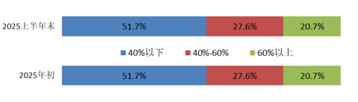 資產(chǎn)負(fù)債率較年初增長的有30家,占比51.7%。資產(chǎn)負(fù)債率超過70%的,年初有8家,上半年末降至6家。期末資產(chǎn)負(fù)債率的最高值為91.2%,無超過100%的情況。資產(chǎn)負(fù)債率分布情況見圖1。