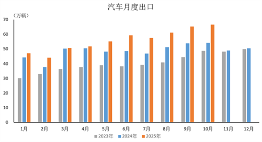2025年10月,汽車出口66.6萬輛,環比增長2.1%,同比增長22.9%。