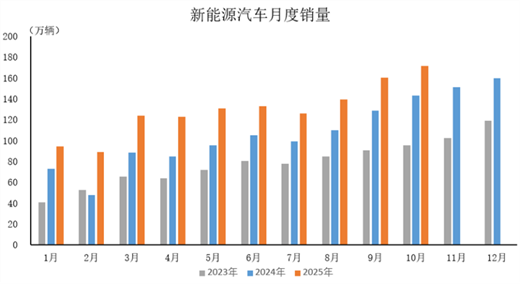 2025年10月,新能源汽車產銷分別完成177.2萬輛和171.5萬輛,同比分別增長21.1%和20%。