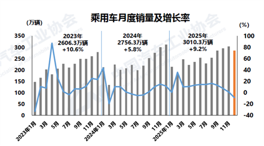 2025年,乘用車產(chǎn)銷累計完成3027萬輛和3010.3萬輛,同比分別增長10.2%和9.2%,乘用車產(chǎn)銷再創(chuàng)歷史新高,首次雙超3000萬輛。