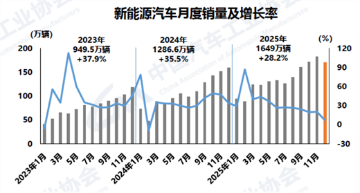 2025年,新能源汽車產(chǎn)銷累計完成1662.6萬輛和1649萬輛,產(chǎn)銷量再創(chuàng)歷史新高,同比分別增長29%和28.2%,新能源汽車新車銷量達到汽車新車總銷量的47.9%。