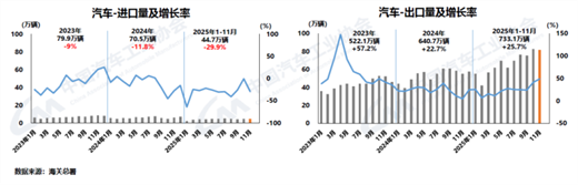 據(jù)中國汽車工業(yè)協(xié)會整理的海關(guān)總署數(shù)據(jù)顯示,2025年1-11月,汽車進口44.7萬輛,同比下降29.9%;出口733.1萬輛,同比增長25.7%。