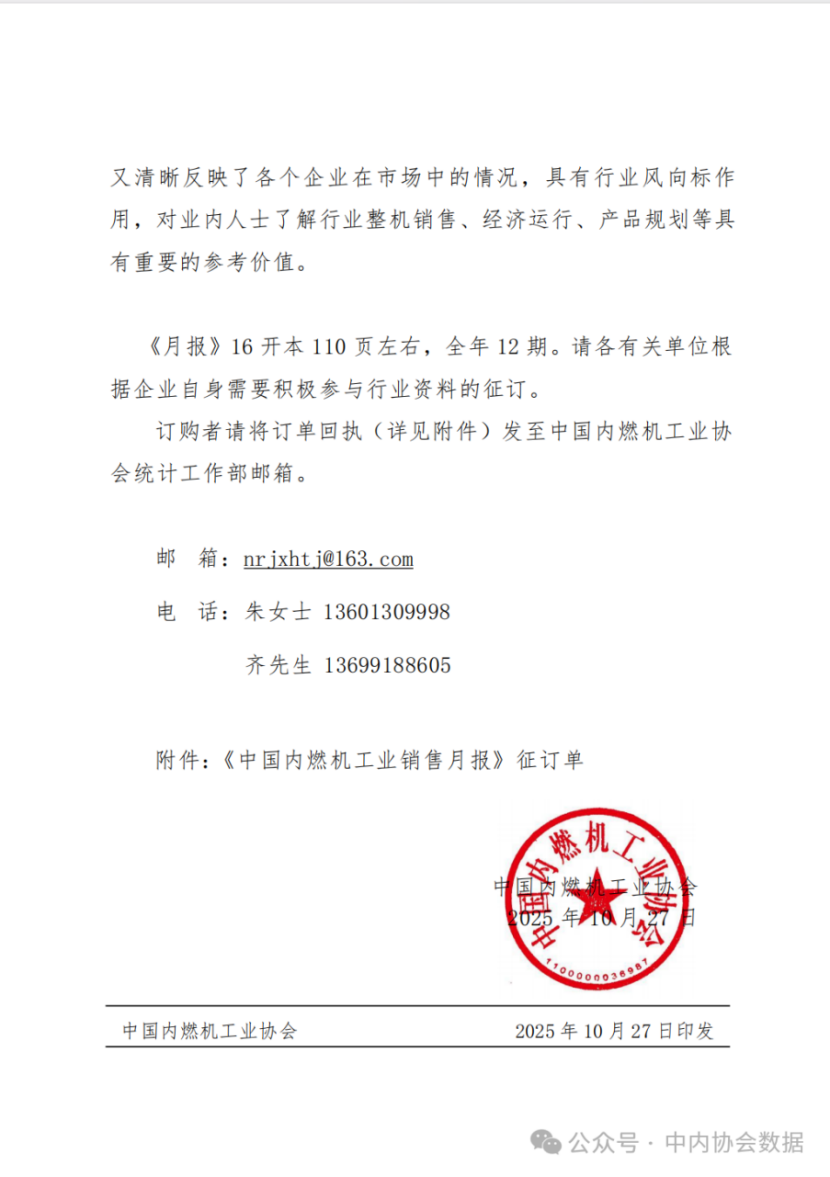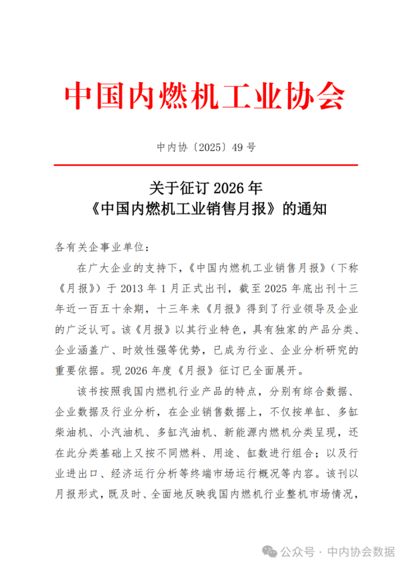 摘要中內協{2025}49號關于征訂2026年《中國內燃機工業銷售月報》的通知。