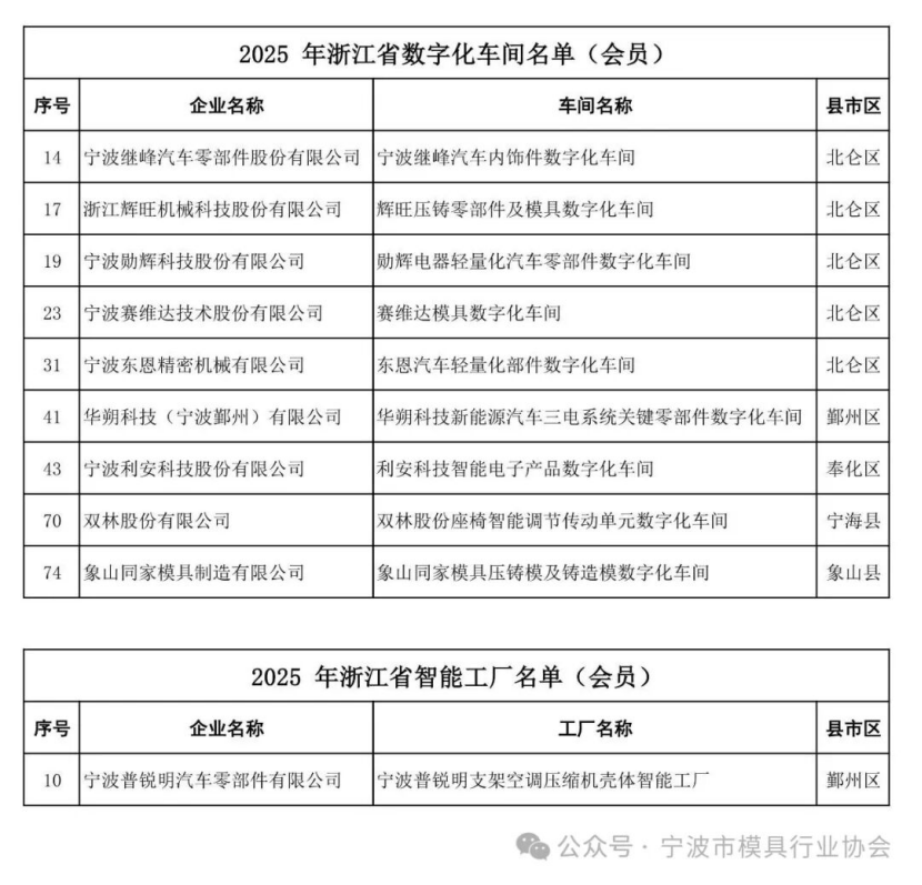 熱烈祝賀繼峰、輝旺、勛輝、賽維達(dá)、東恩、華朔、利安、雙林、同家入選“2025年浙江省數(shù)字化車(chē)間認(rèn)定名單“、普銳明入選浙江省智能工廠認(rèn)定名單”!