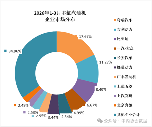 3月多缸汽油機銷量196.43萬臺,環比增長98.81%,同比增長9.54%;1-3月累計銷量454.29萬臺,同比增長-2.80%。在46家多缸汽油機企業中奇瑞、吉利、比亞迪、一汽-大眾、長安汽車、蜂巢動力、廣豐發動機、上通五菱、上汽鄭州、北京奔馳銷量排在前列,占總銷量的65.04%。在銷量較多的企業中,奇瑞、吉利、東風本田銷量增勢表現突出。