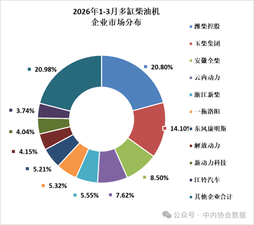 3月,商用車用多缸柴油機銷量22.94萬臺,環比增長46.02%,同比增長9.82%;1-3月累計銷量58.03萬臺,同比增長10.64%。銷量前十的為濰柴、玉柴、云內、江鈴、福康、解放動力、江淮、歐康動力、全柴、東康,其前十名銷量占總銷量89.16%;濰柴在商用車用多缸柴油機市場占據領先占比26.19%、玉柴13.16%、云內8.78%、江鈴7.97%、福康6.48%、解放動力6.12%、江淮5.60%、歐康動力5.32%、全柴5.28%、東康4.26%。