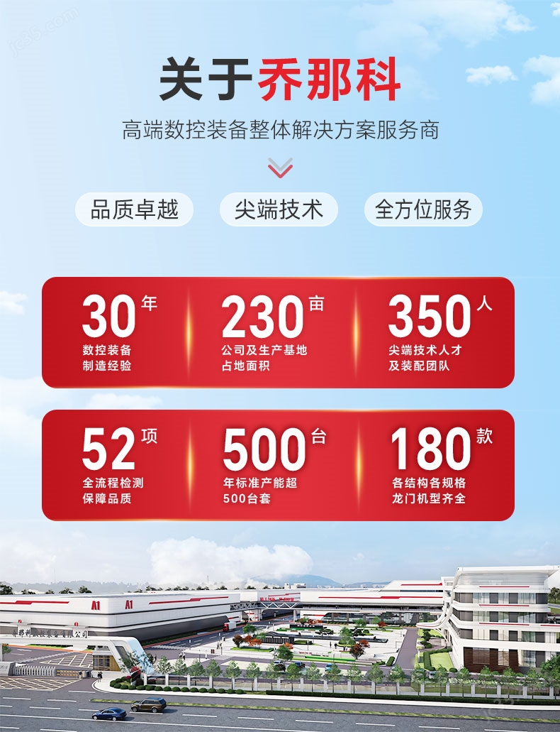 喬那科數控位于江蘇宿遷市,占地230畝,建有恒溫加工、精密裝配、檢測中心等現代化標準廠房,年產500臺數控機床。