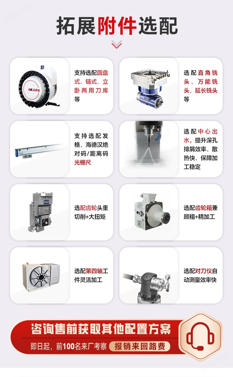可選直角銑頭、萬向銑頭、延伸銑頭、全自動銑頭等附件頭;